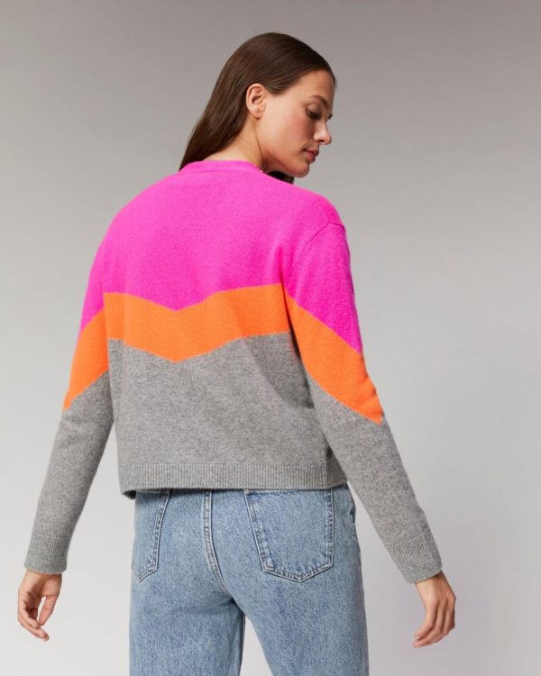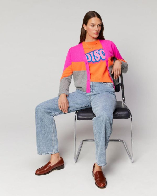 Couleurs vibrantes et bandes tricolores pour ce pull cardigan court en maille 100% cachemire. Muni d’un col rond et de manches longues, il dévoile une fermeture boutonnée siglée « From Future ».