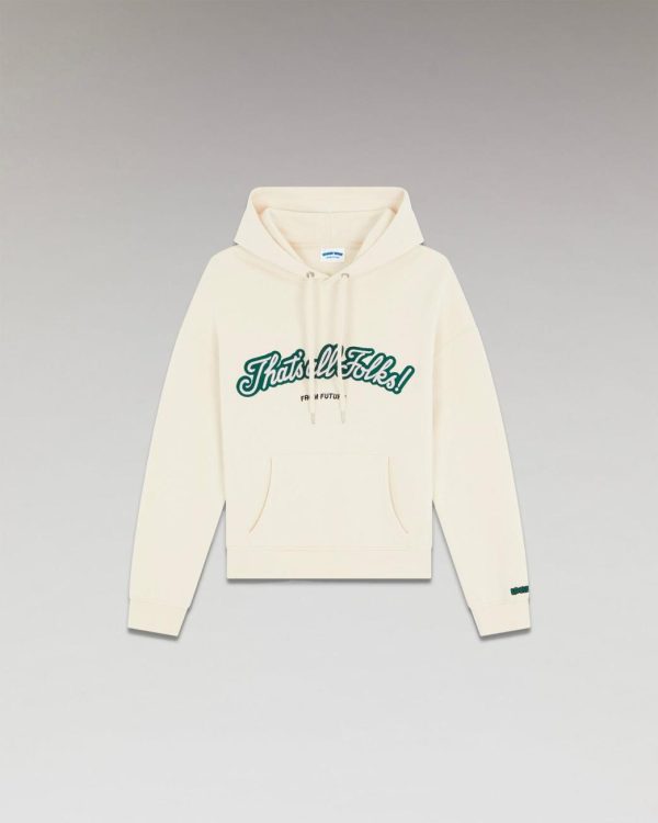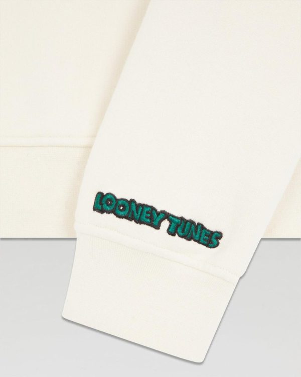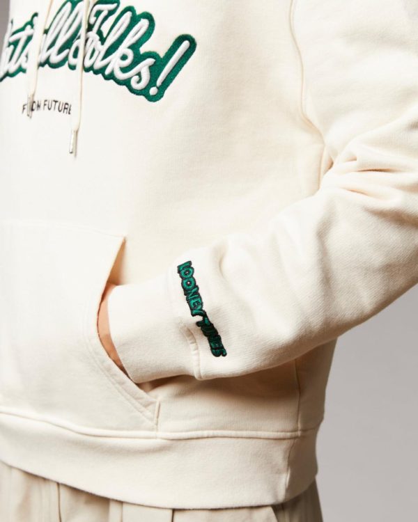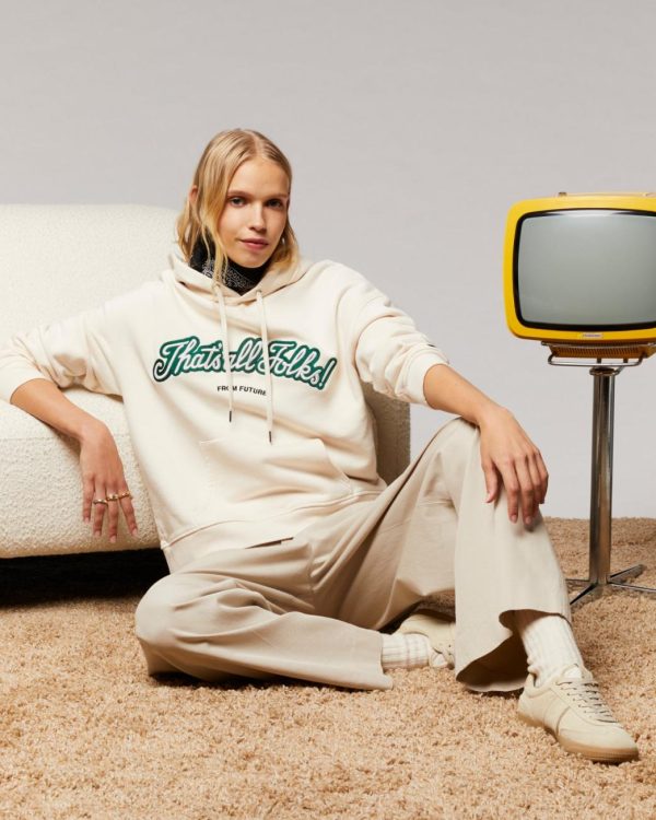 Oversize et molletonné, ce sweatshirt muni d’une capuche à cordons, d’une poche avant et de manches longues, dévoile une broderie contrastée « That’s all Folks! », une signature « From Future » à l’avant et « Looney Tunes » au poignet gauche.