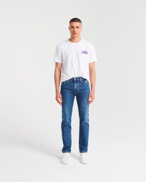 Tout savoir sur Joey : Jean coupe droite, regular fit, 4 poches. Passants pour la ceinture. Fermeture par boutons siglés sur le devant. Broderie FROM FUTURE semi-cachée au niveau de la poche gauche. Jacron coloré à l’arrière.