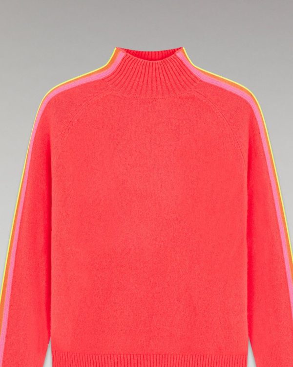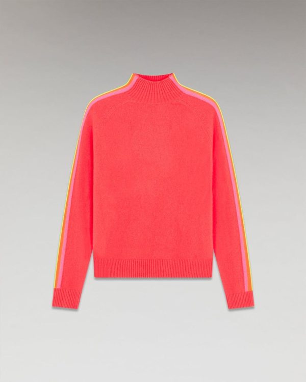 Douceur et légèreté pour ce pull court confectionné en cachemire 2 fils qui capture l’essence du style futuriste. Muni d’un col montant et de bords côtelés, il se twiste de bandes aux couleurs vibrantes le long des manches. Idéal pour structurer la silhouette avec audace, mixez-le à un jean casual ou une jupe fluide.
